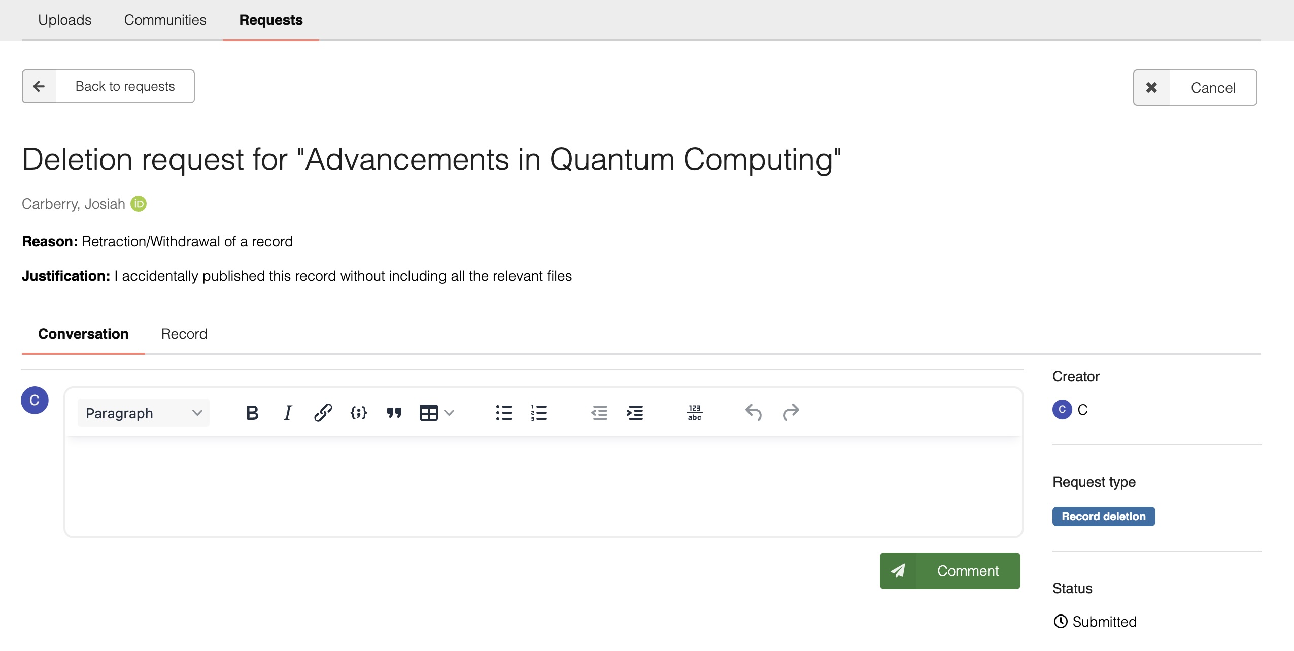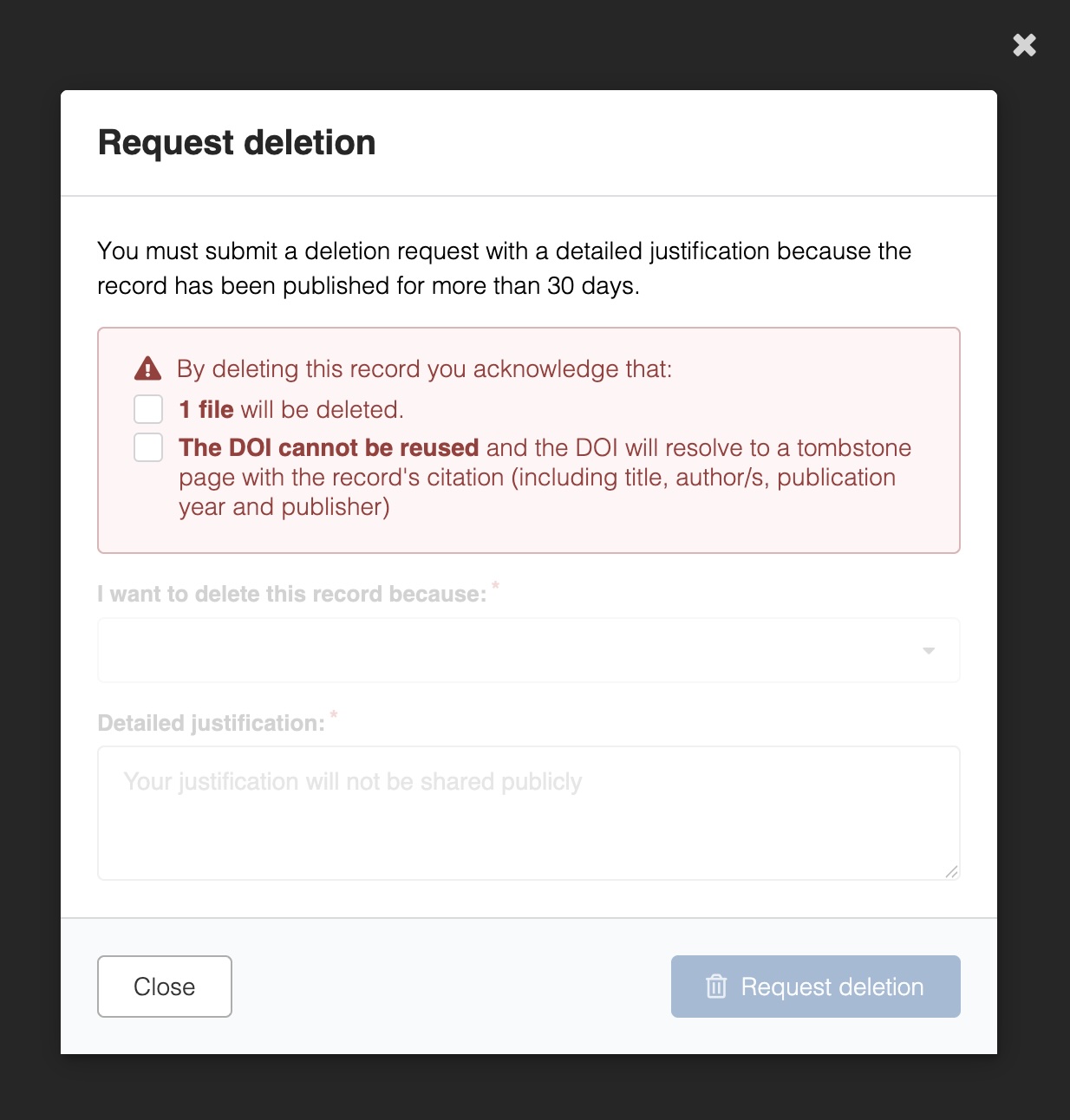 In the modal that appears, acknowledge that the record will be deleted, select the removal reason and provide a detailed justification. Finally press the Request deletion button on the bottom right.