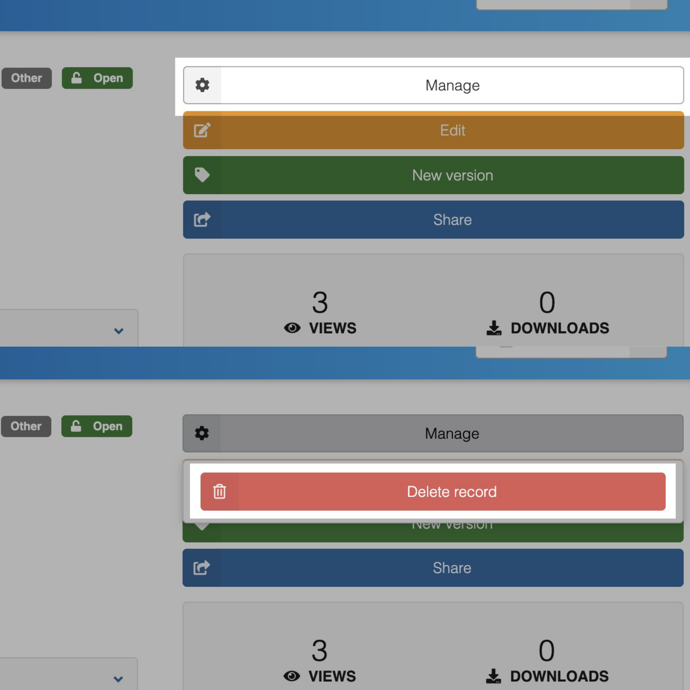 From the record landing page, click on the Manage record dropdown and then the Delete record button.