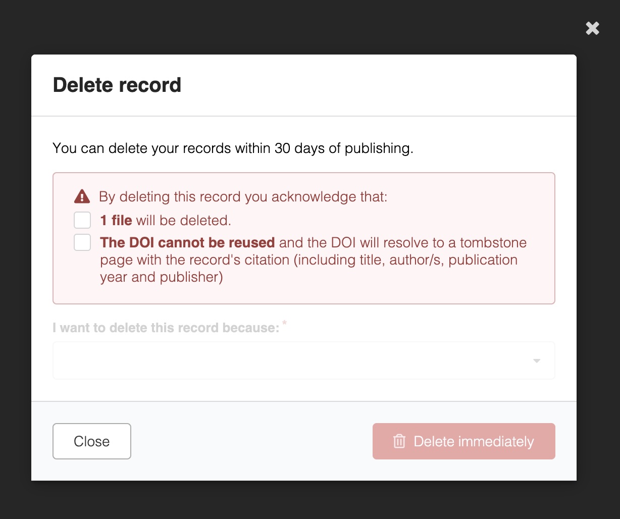 In the modal that appears, acknowledge that the record will be deleted and select the removal reason. Finally press the Delete immediately button on the bottom right.