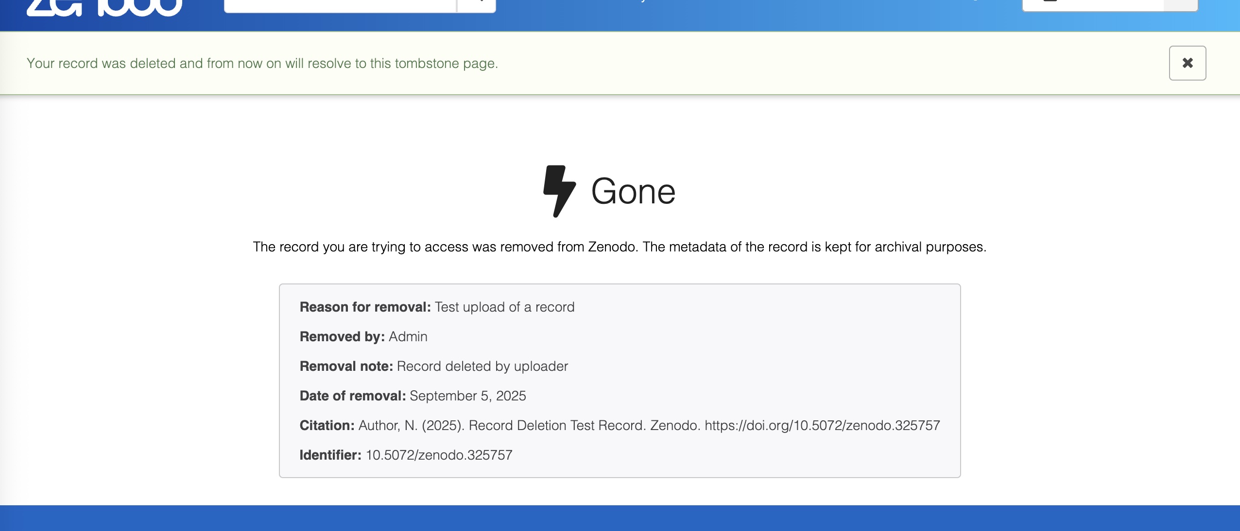 The record will be deleted and you will be redirected to the tombstone page containing the citation for archival purposes.